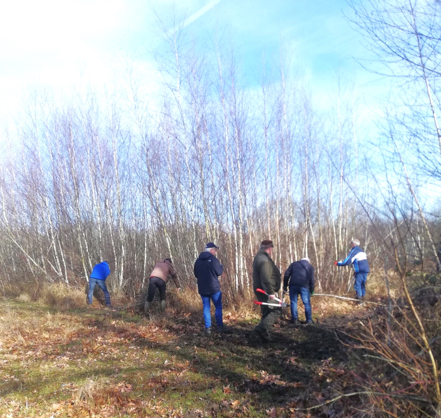 In het kader van NLDoet, kwamen er op zaterdag 11 maart zo'n 15 personen naar de loods aan de Verlengde Rietweg in Belfeld. Gelukkig waren de weergoden ons erg gunstig gezind. zelfs de zon werd gezien die dag. Na een kort welkomstwoordje en begroeting door Hans van een aantal bekende én, verheugend natuurlijk, nieuwe gezichten, werden de taken van deze dag verdeeld. Zo is er gewerkt aan het plaatsen van nieuwe zware hoekpalen, de bedrading vernieuwd, oude weipalen vervangen, afgebroken en afgezaagde takken op rillen gelegd, en is ongewenste berkenopslag aangepakt, zie foto. Omroep Venlo was ook aanwezig en het resultaat van hun opnames zijn nu ook te zien op het tabblad MULTIMEDIA . Rond 12 uur waren de belangrijkste klussen geklaard en kon er worden aangeschoven voor de catering. Met dank aan de dames voor de lekker soep en belegde broodjes! Hierna werd nog een uurtje aan de afronding van het weideraster besteed en nagepraat met een biertje.