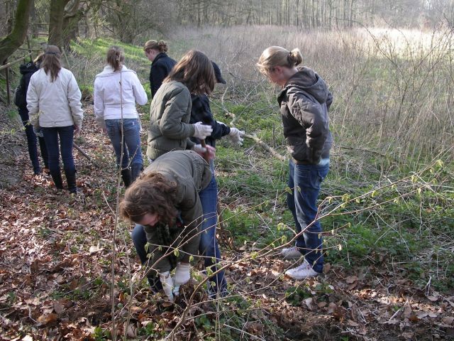 Hierna gingen ze in groepjes in het veld aan het werk en werd er aangeplant, gesnoeid en teruggezet. Een stukje zandhelling werd geschikt gemaakt als broedplaats voor de ijsvogel. Leerlingen waren erg enthousiast. Hieronder een paar actiefoto's.